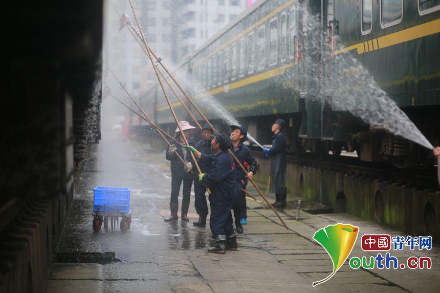 重庆车辆段重庆北运用车间整备队职工对列车进行清洗作业。中国青年网通讯员 苏志刚 摄