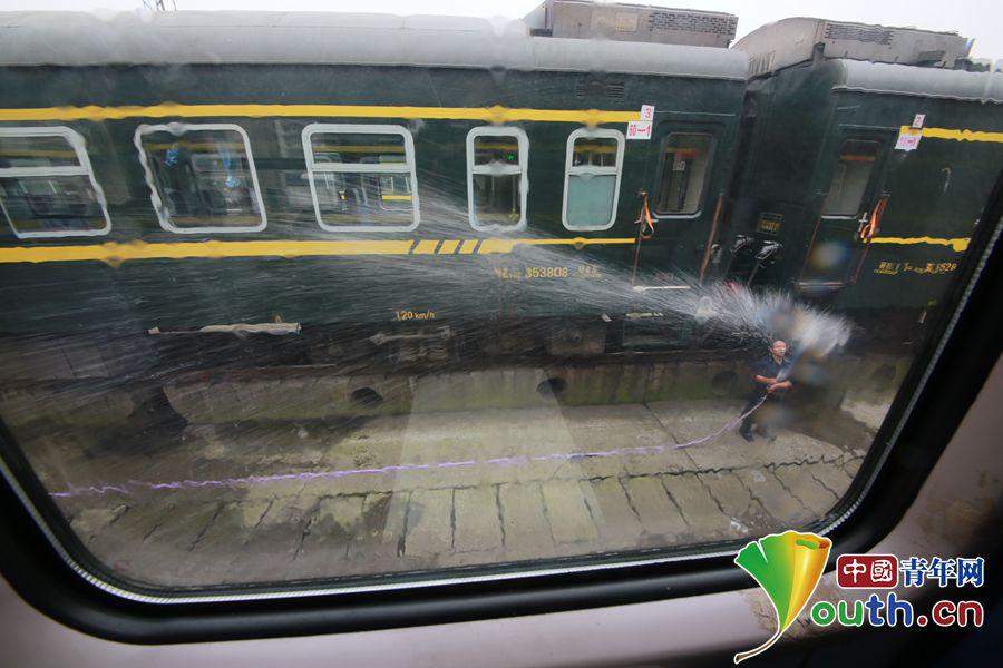 车厢外是列车“洗澡工”们忙碌的身影。中国青年网通讯员 苏志刚 摄