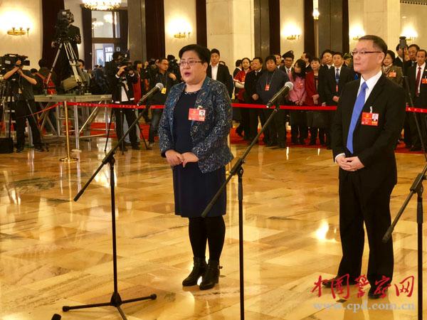 张宝艳在“代表通道”上接受记者采访。中国警察网记者王旭东 摄