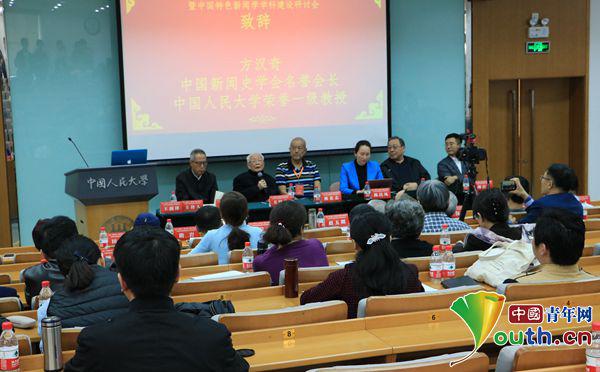 中国新闻史学会名誉会长、中国人民大学荣誉一级教授方汉奇致辞(前排左二)。中国青年网记者李川 摄