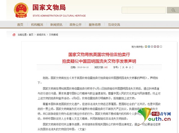 中国青年网北京4月10日电(记者 邵志凯) 刚刚,国家文物局发出《关于英国坎特伯雷拍卖行拍卖疑似中国圆明园流失文物事的声明》,声明称:国家文物局强烈反对并谴责坎特伯雷拍卖行不顾中方严正抗议,执意拍卖疑似非法流失文物,并以战争劫掠文物为名进行商业炒作的行为。国家文物局不赞成境内机构和个人参与上述文物的竞拍活动,并呼吁国际友好人士本着人文主义精神,共同抵制疑似非法流失文物拍卖。