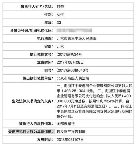 4月14日,澎湃新闻从中国执行信息公开网上看到,因与中泰创展的纠纷,案号(2017)京03执646号,贾跃亭、甘薇、乐视控股被列为了失信被执行人。