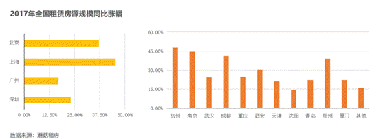 对比2017年全国不同地区的租赁房源数据,除北、上、广、深4座城市依旧维持稳定增速以外,以杭州、南京为代表的11个国家中心城市,呈现出快速扩张趋势。
