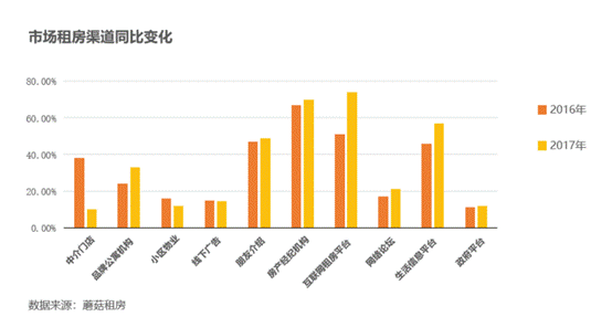 中国青年网北京4月28日电(记者 李晗)4月27日,中国租房市场产业白皮书在京发布。蘑菇租房联合创始人龙东平表示,租房行业发展至今,传统的租房方式逐渐被以互联网租房为代表的新形业态所取代,数据显示,2017年通过中介门店寻租的比例大幅缩减,而以专业租赁运营机构、互联网租房平台为代表的新租房模式占比却得到迅猛增长。