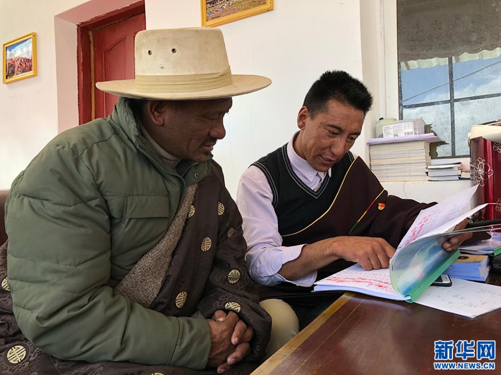 岗莎村党支部副书记兼村主任久美多吉(右)和牦牛运输服务队一组组长(左)正在核算收入。新华网 雪珍摄