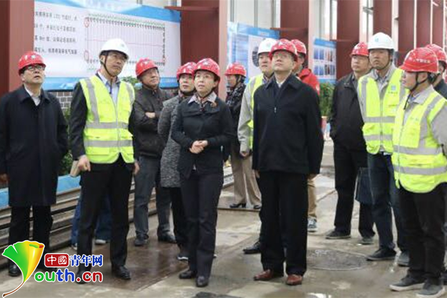 北京市政协副主席程红(左五)到19号线03标段现场视察。中国青年网通讯员宋雨摄