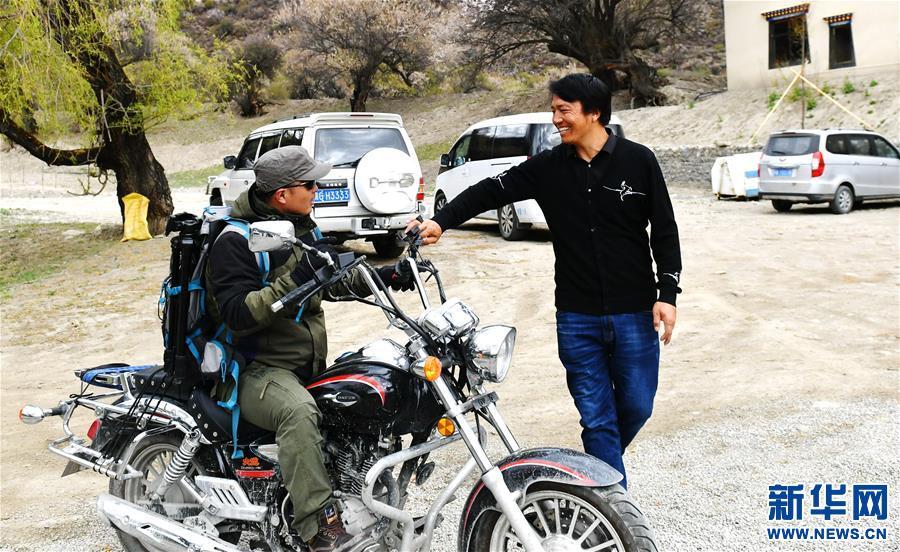 林芝市派镇吞白村民小组组长乔罗布(右)迎接一名自驾游游客(4月22日摄)。新华社记者 张汝锋 摄