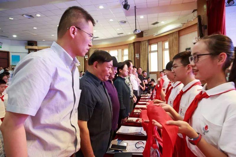下午4时许,伴随着嘹亮的中国少年先锋队队歌,会场洋溢着斑彩的童年气息,主题活动正式开始。少先队员代表们走到前排,为专程赶来参加活动院士、将军,以及与会嘉宾系上红领巾,鲜艳的红领巾交叉、敬礼,目送、微笑,这既是一种仪式,更是专家前辈后辈的期望和祝福。