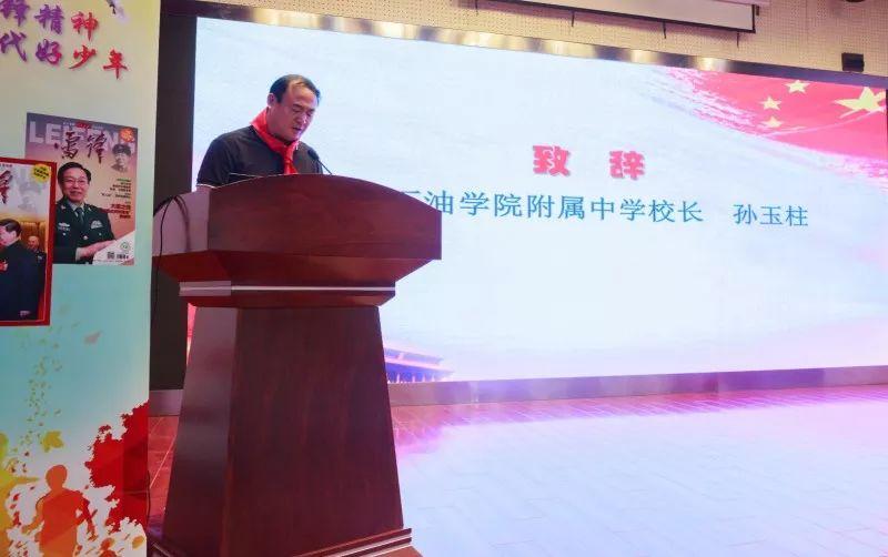 北京石油学院附属中学校长孙玉柱致辞,首先表达对前来参加活动的院士、将军及主办方领导致以真挚的欢迎和感谢。其次,孙玉柱校长介绍了石油学院附中的发展史,学校创建于1960年,半世纪以来,该校坚持以雷锋、王进喜等榜样树人、育人,工人先驱——铁人王进喜“为国分忧、为民族争气”的家国情怀在一代代石油附中人心中生根、开花、结果。