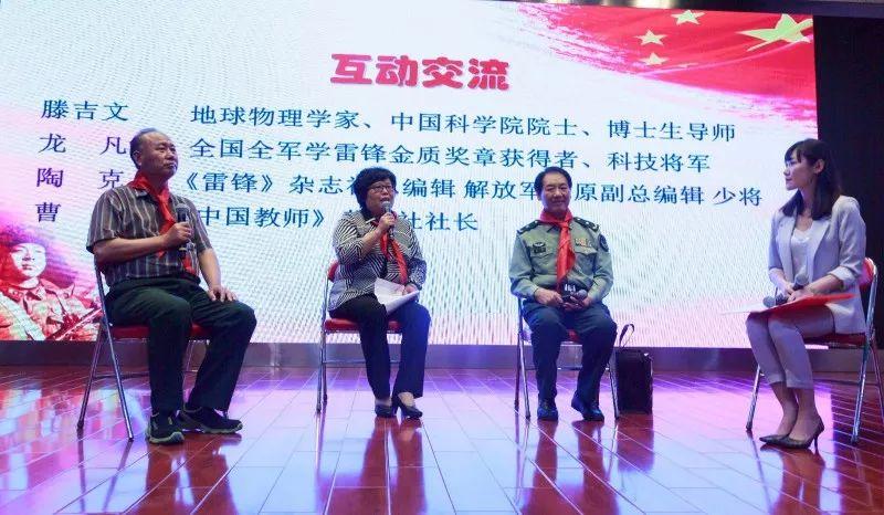 二人激情饱满、扣人心弦的演使得现场同学听得意犹未尽,互动环节中,《雷锋》杂志总编辑陶克将军、中国教师杂志社社长曹巍、龙凡将军与同学们对话交流,通过精彩对话,再次升华继承和传播雷锋精神的历史积淀与人文氛围,这一精神财富将凝聚成为引领青少年成长的精神富矿。青少年也该继承院士和将军身上的家国情怀,将个人发展、民族命运紧密相连的光荣传统,以及雷锋为党和国家、人民付出一切的无私奉献精神,从而成为兼济天下的道德情操。
