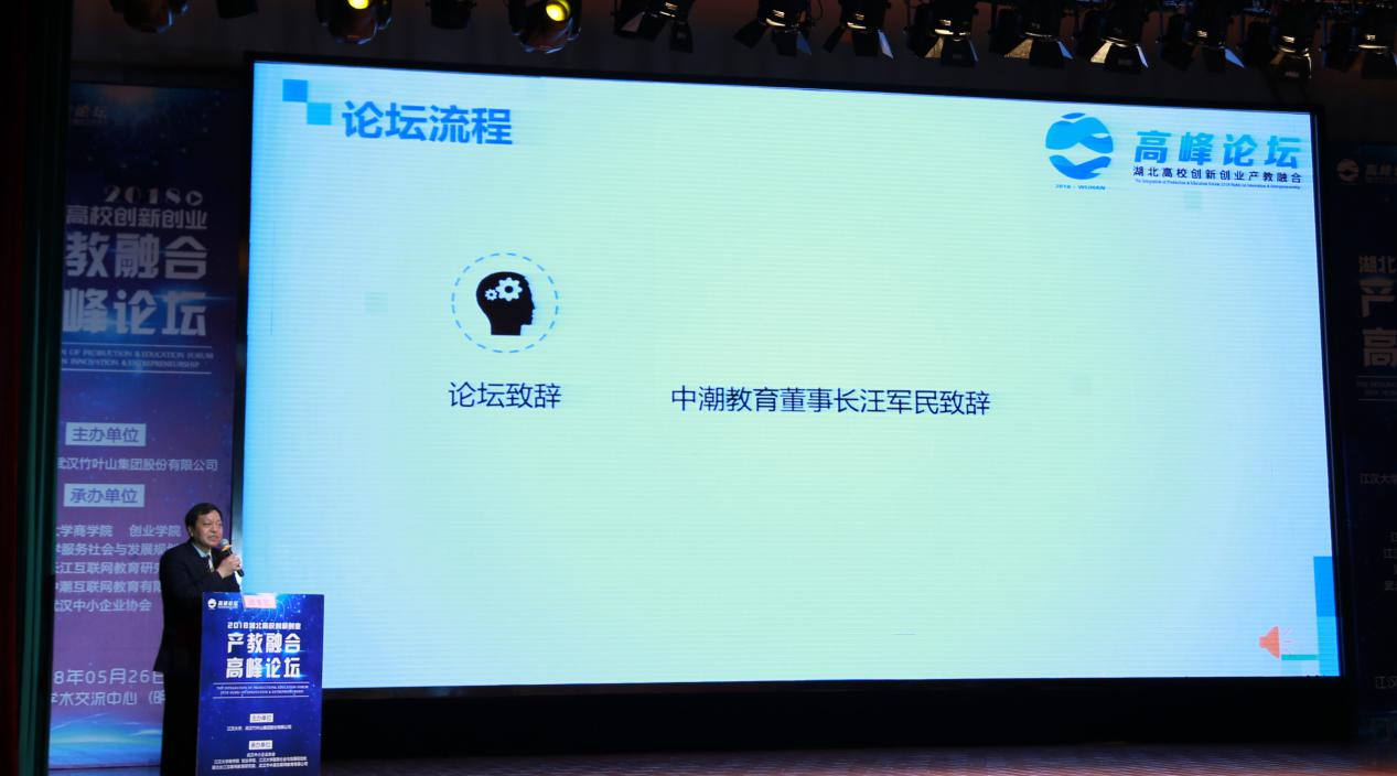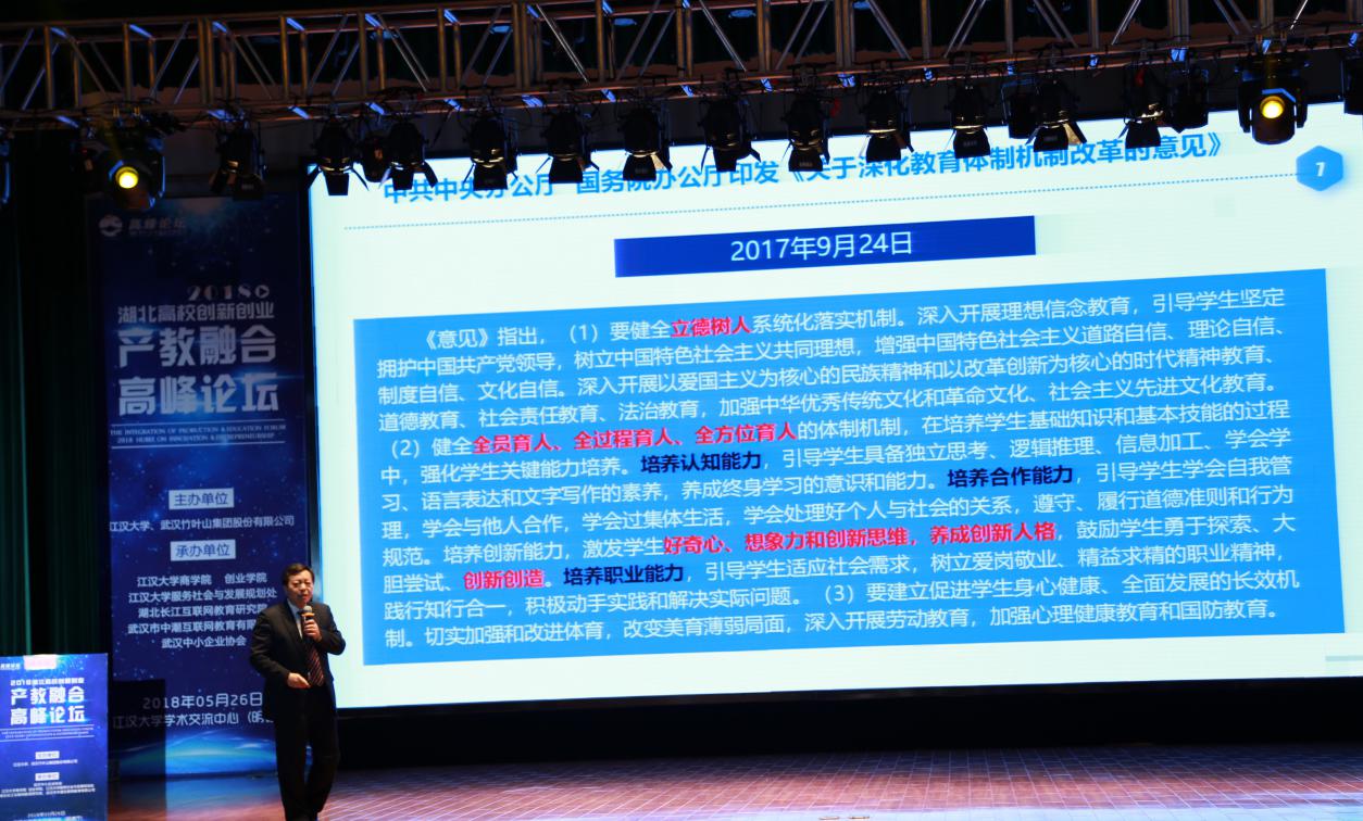 中国青年网北京5月29日电 随着中国经济调整结构、转型发展,如何深化产教融合促进教育链、人才链与产业链、创新链有机衔接成为当前的重要课题。为贯彻落实《国务院办公厅关于深化产教融合的若干意见》(国办发〔2017〕95号)等文件精神,进一步深化产教融合、产学合作,汇聚企业资源支持高校创新创业教育,促进高校人才培养与企业发展的合作共赢,营造良好的“产教融合”协同育人的创新创业环境,5月26日,由江汉大学、武汉竹叶山集团股份有限公司主办,中潮互联网教育有限公司、长江互联网教育研究院、武汉中小企业协会承办的“2018高校创新创业产教融合高峰论坛”在江汉大学学术交流中心召开,来自省内外几十余位创新创业领域的专家、学者、企业家发表了主题演讲,100多所高校的300多位代表出席了论坛。