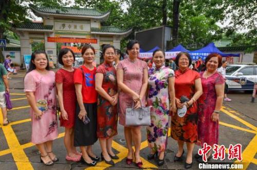 图为考生家长身着旗袍为考生加油,祈福旗开得胜。 骆云飞 摄