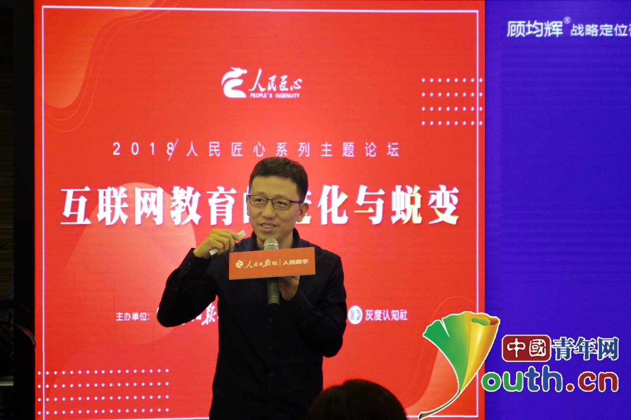 6月21日,顾均辉在主题为“互联网教育的进化与蜕变”的论坛中发表主旨演讲,他表示,不是产品上线了就有机会火,而是品牌必须出现在消费者的大脑里面,也就是说“品牌决胜要在心智”。图片由主办方提供。