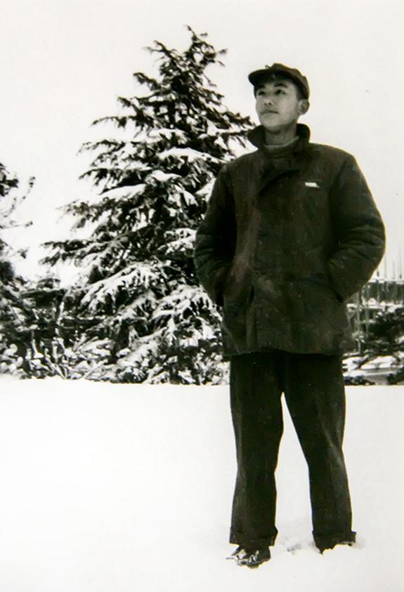 1952年,厉声教以优异的成绩考入南京大学。图为1953年冬,18岁时的厉声教在南京大学北大楼雪松处(雪松是南大坚忍不拔奋发精神的象征)。