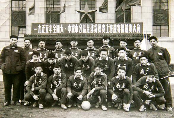 大学时期,厉声教的运动天分得到了进一步的展现。他不仅是南京大学校足球队和篮球队的主力队员,还被选拔为南京市足球队和篮球队的队员,并在南京大学首届校运会上夺得男子100米短跑季军,多次代表所在城市参加地区及全国性体育比赛,是学校的风云人物。图为1955年,南京市足球队队员合影(第一排右二为厉声教)。