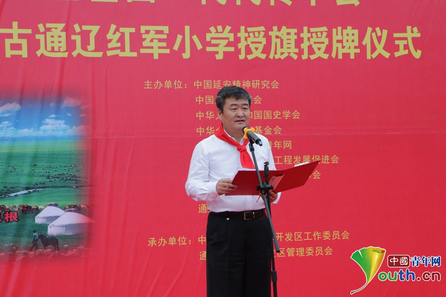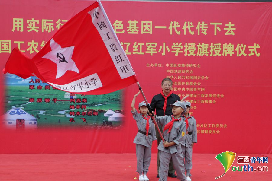 全国红军小学建设工程理事会副理事长陈知庶向内蒙古通辽红军小学授校旗。中国青年网记者 李川摄