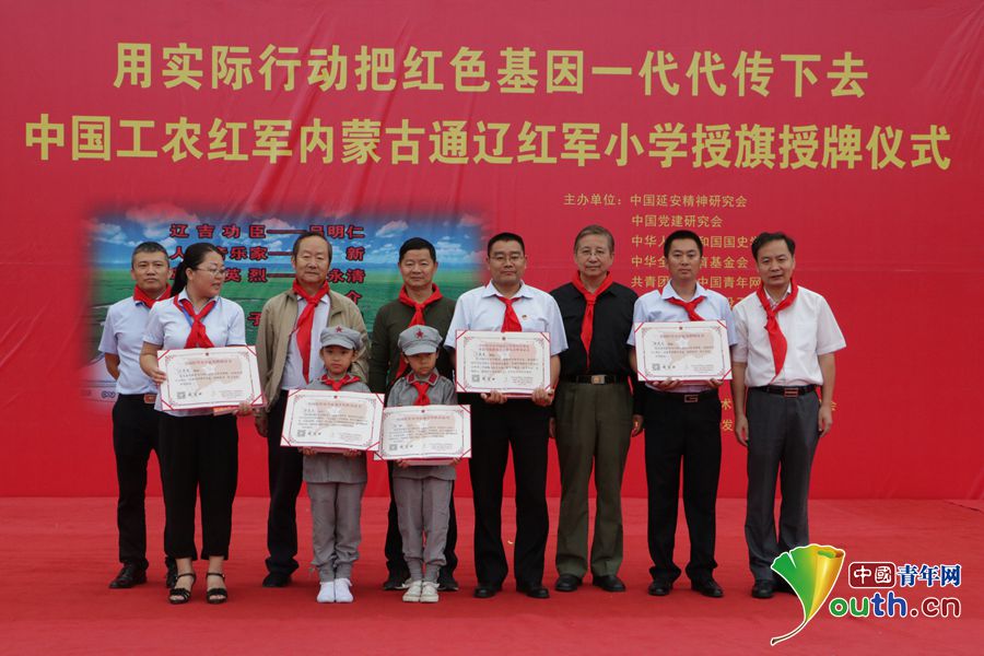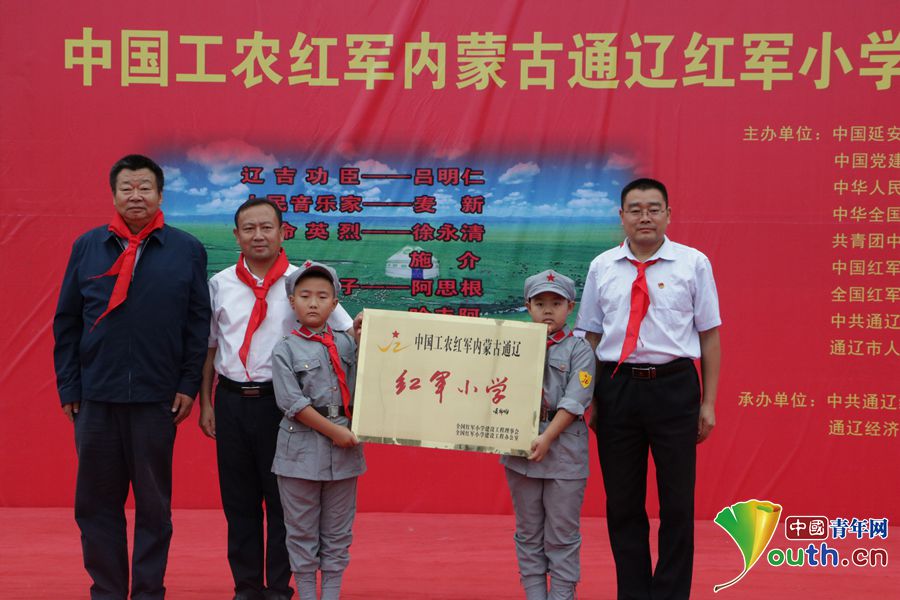 全国红军小学建设工程理事会副理事长兼秘书长方强向内蒙古通辽红军小学授校牌(左一),通辽市经济技术开发区党工委书记王会阁(左二)、内蒙古通辽红军小学校长于春来(右一)上台接牌。中国青年网记者 李川摄