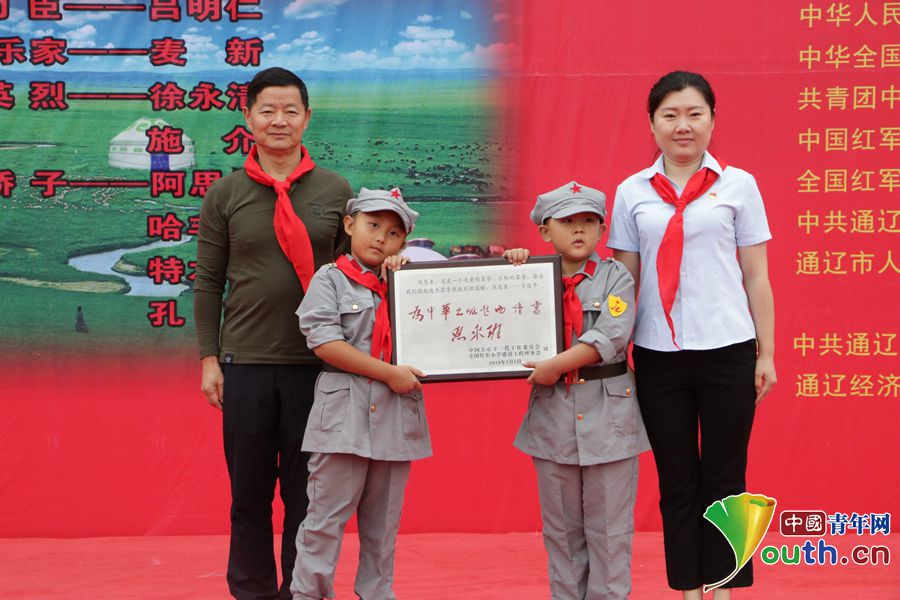 全国红军小学建设工程理事会顾问万晓援(左一)向内蒙古通辽红军小学授“恩来班”班牌。中国青年网记者 李川摄