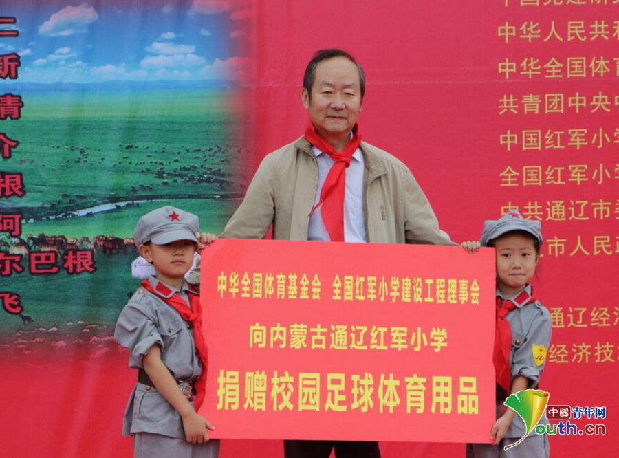 全国红军小学建设工程理事会副理事长高屹代表中华全国体育基金会、全国红军小学建设工程理事会向内蒙古通辽红军小学捐赠校园足球体育用品。中国青年网记者 李川摄