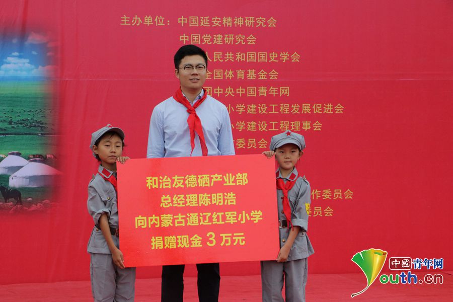 全国红军小学建设工程理事会宣传部副部长刘长龙代表和治友德硒产业部总经理陈明浩向内蒙古通辽红军小学捐赠人民币3万元。中国青年网记者 李川摄