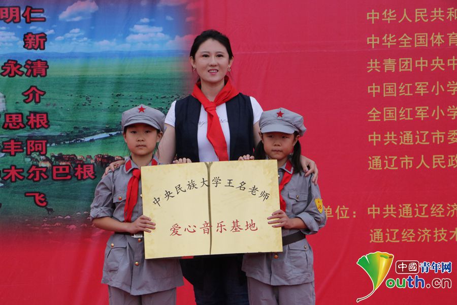 中央民族大学教育学院教师王名向内蒙古通辽红军小学授“爱心音乐基地”牌匾。中国青年网记者 李川摄