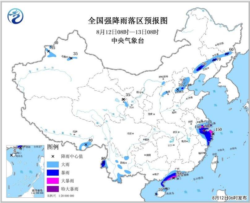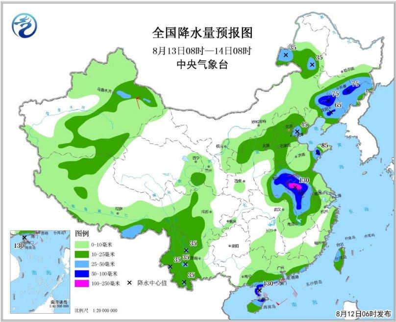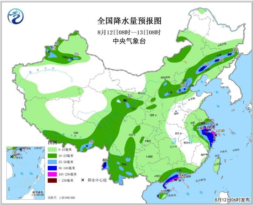 中央气象台8月12日06时发布暴雨黄色预警:预计,8月12日08时至13日08时,浙江大部、上海、江苏南部、安徽东南部、广东南部、海南岛北部和西部、云南以及吉林中部、辽宁西部、北京东部、天津大部、河北中部和东北部、山西中部、青海东北部、新疆沿天山一带和伊犁河谷地区等地的部分地区有大雨或暴雨,其中,浙江北部、江苏南部、广东西南部、海南岛北部局地有大暴雨或特大暴雨(100~260毫米);上述局地伴有短时强降水等强对流天气,小时降水量20~50毫米,局地70毫米以上(见图2)。