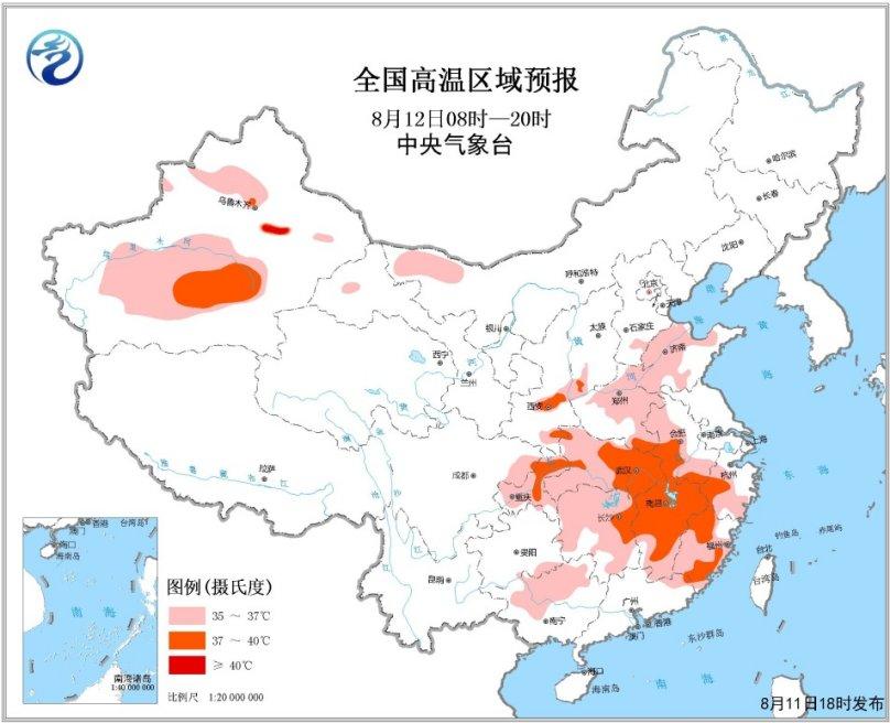 预计8月12日白天,陕西关中和东南部地区、华北南部、黄淮中西部和北部、江淮西部、江汉大部、江南大部、重庆、广西西北部及新疆南疆盆地和沿天山一带等地的最高气温有35~36℃,其中,新疆南部和沿天山一带、陕西关中和东南部地区、湖北东部、重庆中北部、湖南东部、安徽西南部、江西大部、浙江西部、福建西北部和东南部等地的部分地区最高气温37~39℃,新疆局地可达40℃以上(见图3)。中央气象台8月12日06时继续发布高温黄色预警。
