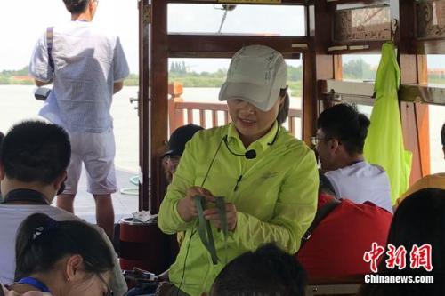 导游在用芦苇叶教游客编织简易工艺品。 姜雨薇 摄