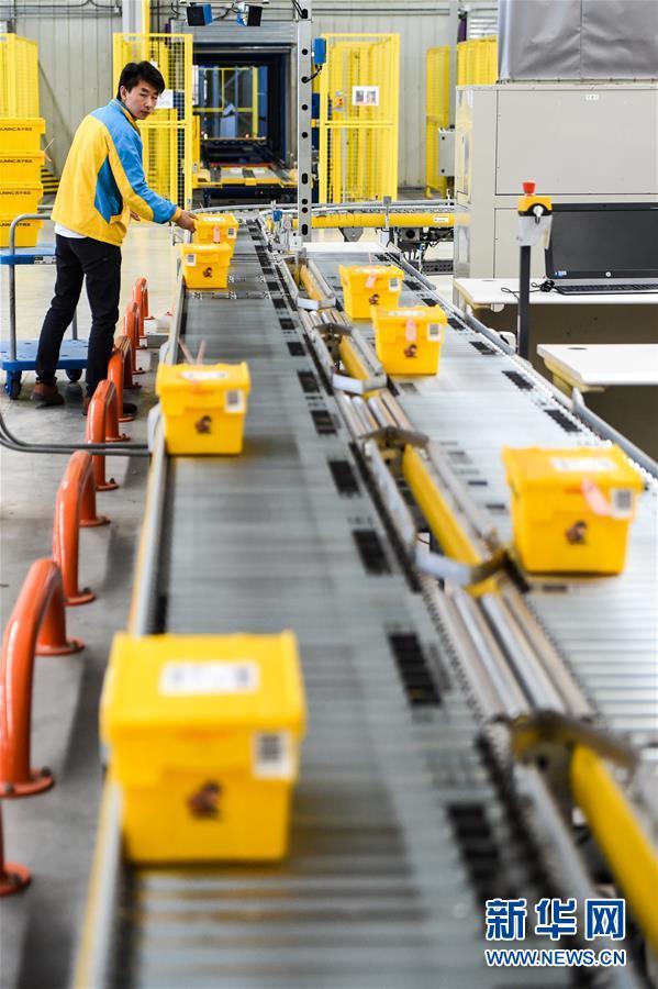 在江苏南京苏宁云仓物流基地,工作人员将包装好的“共享快递盒”放到传送带上,准备进行分拣运输(2017年10月31日摄)。新华社记者 李博 摄