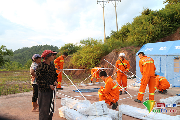 9月9日下午,灾区群众等待武警普洱支队救援官兵搭建帐篷。中国青年网通讯员 郭金宝 摄