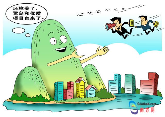 落实绿色发展理念,村民一边享受着天蓝、地绿、水净的优质环境,另一边也分享着经济快速发展带来的“金山银山”。(漫画作者:朱慧卿)