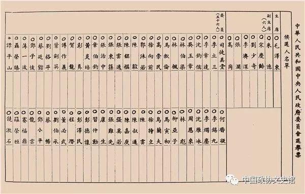 中国人民政治协商会议第一届全体会议选举中华人民共和国中央人民政府委员会主席、副主席、委员的选票