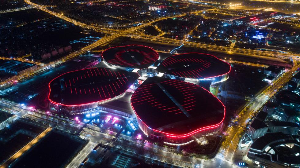 博览会举办地国家会展中心周边灯光配套提升工程近日首次试灯,55000盏LED灯同时亮起,将夜空渲染得美不胜收。
