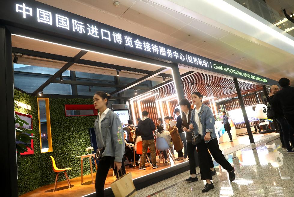 旅客从上海虹桥国际机场的中国国际进口博览会接待服务中心前走过(10月24日摄)。新华社记者 陈飞 摄