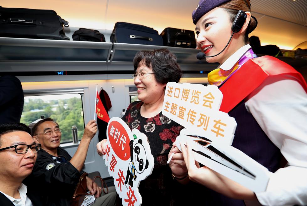 乘务员在首列复兴号“进口博览会主题宣传列车”上向旅客宣传进博会相关信息(10月10日摄)。新华社记者 陈飞 摄