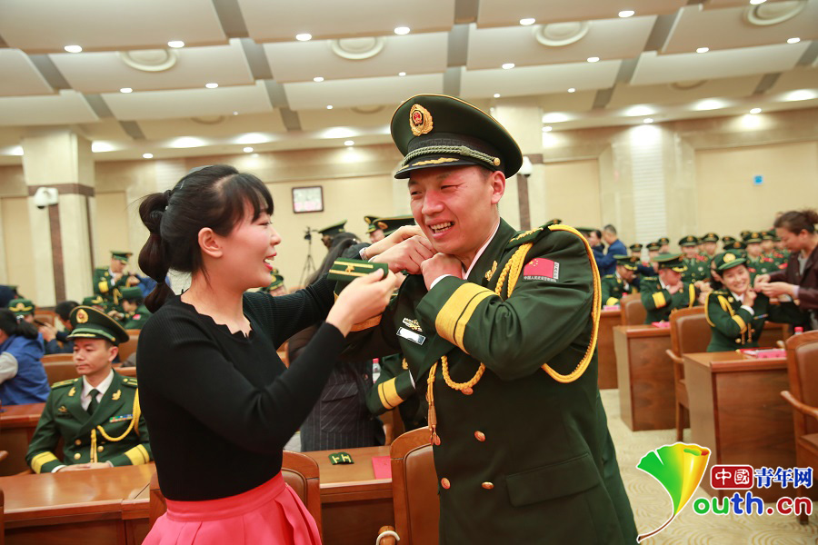 妻子悉心为丈夫戴上警衔。中国青年网通讯员 张猛 摄