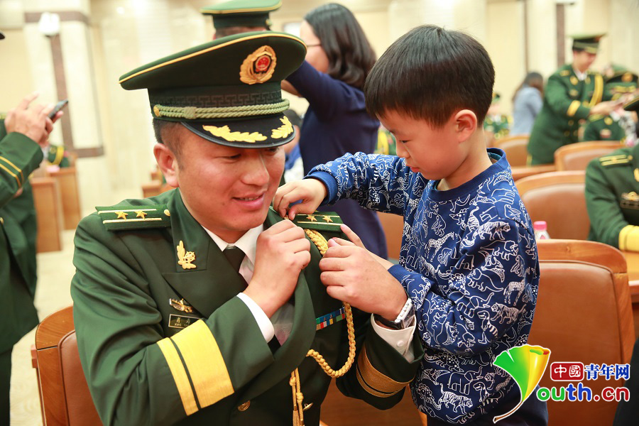 儿子为爸爸换上警衔。中国青年网通讯员 张猛 摄