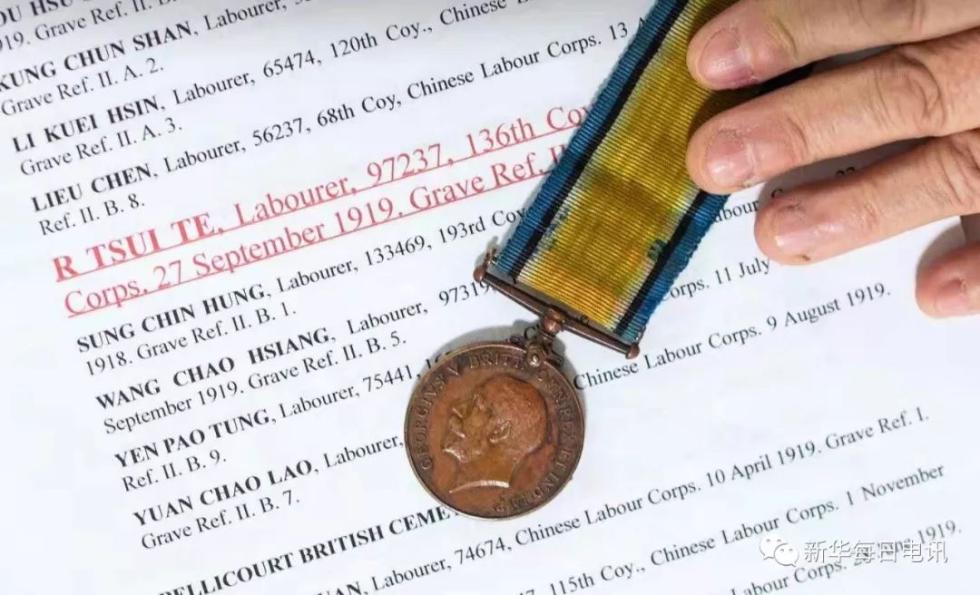 华工后裔程玲展示华工爷爷毕粹德的铜质勋章以及英国军人墓葬管理委员会提供的毕粹德在内的一战华工阵亡名单。记者王阳摄(拍摄时间:10月30日)