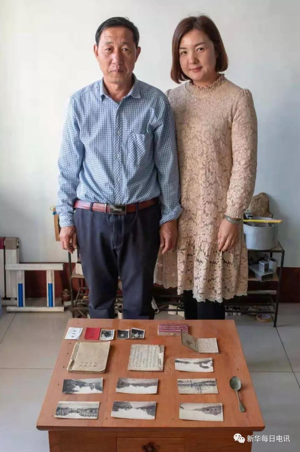 华工后裔马京东及其女儿在潍坊市临朐县自家工厂内合影,身前摆放着马春苓的遗物。记者王阳摄(拍摄时间:10月23日)