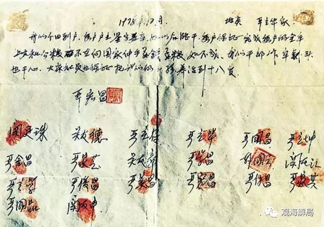 1978年冬,安徽省凤阳县小岗村18户农民,以敢为天下先的精神,在一纸分田到户的“秘密契约”上按下鲜红的手印,实行农业“大包干”,从此拉开我国农村改革的序幕。这18位带头人的红手印催生了家庭联产承包责任制,并最终上升为我国农村的基本经营制度,彻底打破“一大二公”的人民公社体制,解放了农村生产力,使我国农业发展越过长期短缺状态,解决了农民的温饱问题。“大包干”契约作为改革开放珍贵文物,陈列在国家博物馆,彰显了小岗村作为我国农村改革的主要发源地和中国改革标志的历史地位。