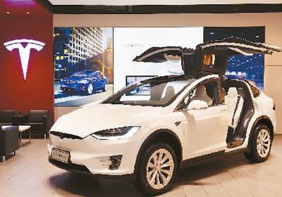 位于北京CBD美国特斯拉公司中国总部展示的电动汽车。新华社记者 罗晓光摄