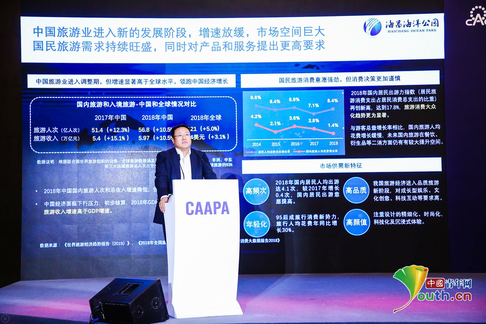 海昌海洋公园控股有限公司行政总裁王旭光就“新形势下主题公园的投资与运营”进行了演讲,他认为,中国旅游业进入新的发展阶段,增速放缓,市场空间巨大,国民旅游需求持续旺盛,同时也面临激烈竞争、政策规范、运营能力等方面的挑战,企业需修炼自身内功,增强产品和运营能力,顺应强IP、轻资产输出和新业态频现的当代主题公园发展趋势。