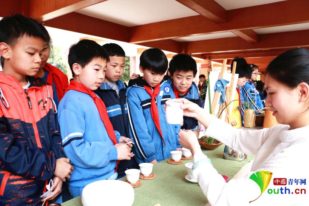 3月29日,长沙市雨花区红星实验小学非遗进校园展示活动现场,图为同学们在展示现场观看茶艺表演。中国青年网记者郭凯薇 摄