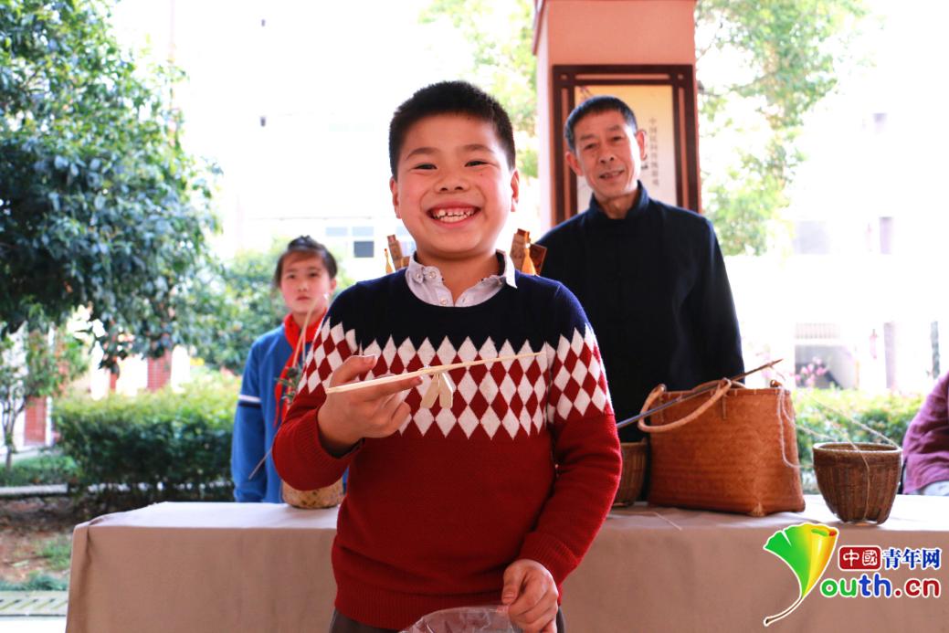 小朋友在展示竹编老师制作的竹蜻蜓。中国青年网记者 郭凯薇 摄