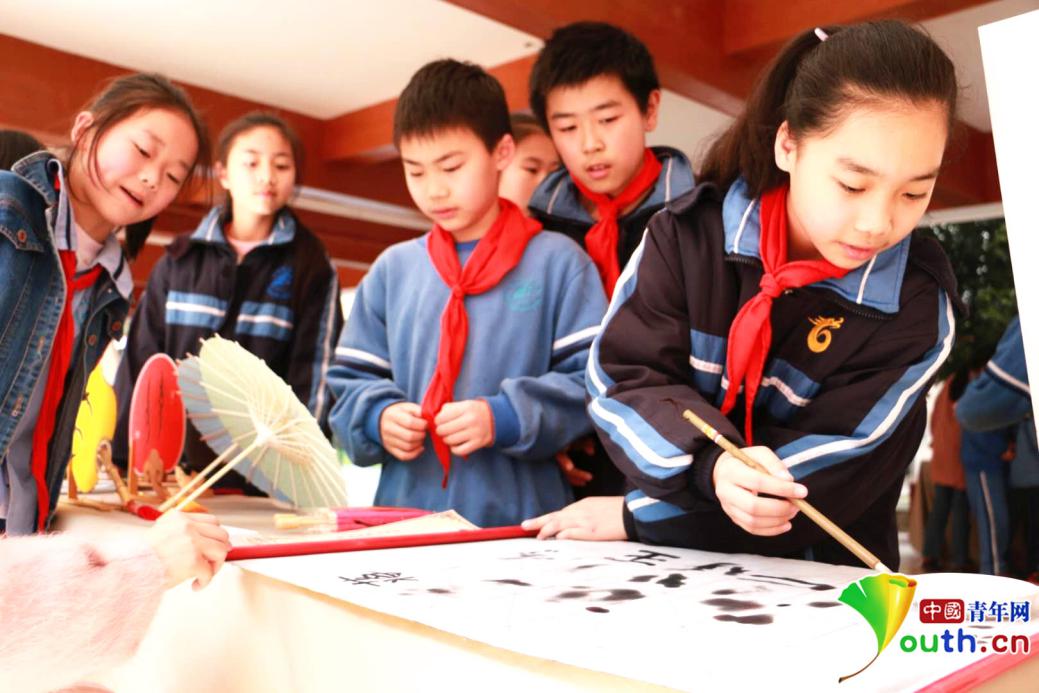 红星实验小学非遗展现场,同学们在练习女书书法。中国青年网记者 郭凯薇 摄