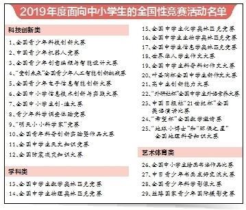 本报讯(记者 任敏)昨天教育部发布《关于公布2019年度面向中小学生的全国性竞赛活动的通知》,正式确定科技创新类、学科类、艺术体育类全国性竞赛活动共29项。