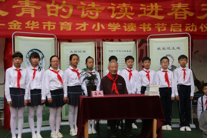 “一本好书往往可以影响一个人的人生,希望大家可以看到书的力量,养成好的读书习惯,走出缤纷璀璨的人生道路”,这是活动受邀嘉宾、儿童文学理论家、浙师大原校长蒋风对育才师生们的寄语。蒋风说:“诗歌的语言相比普通文字更具有直击人心的力量,希望大家可以借助读书节朗读艾青诗歌的契机,在心中培育出爱的种子,培养出文化自信。”