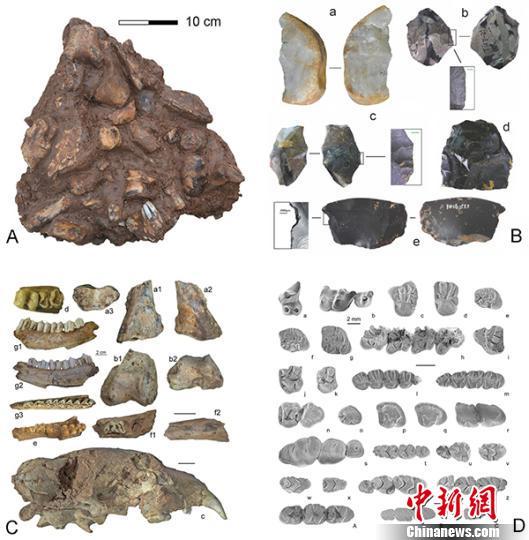 A,华龙洞遗址动物化石堆积情况;B,出土的石制品;C、D,哺乳动物化石。同号文、李强、裴树文/供图