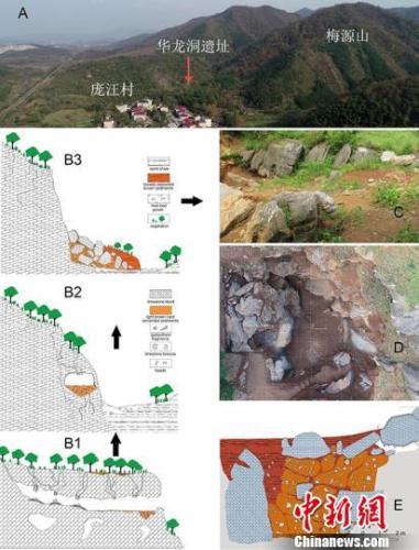 华龙洞遗址及其化石分布情况:A,华龙洞周边地貌特征;B1-B3,遗址形成过程模式图;C,2014年华龙洞发掘前景象;D,2016年华龙洞遗址发掘后空中俯视图;E,出土人类头骨化石点遗址纵向切面模式图。蔡演军、裴树文/供图