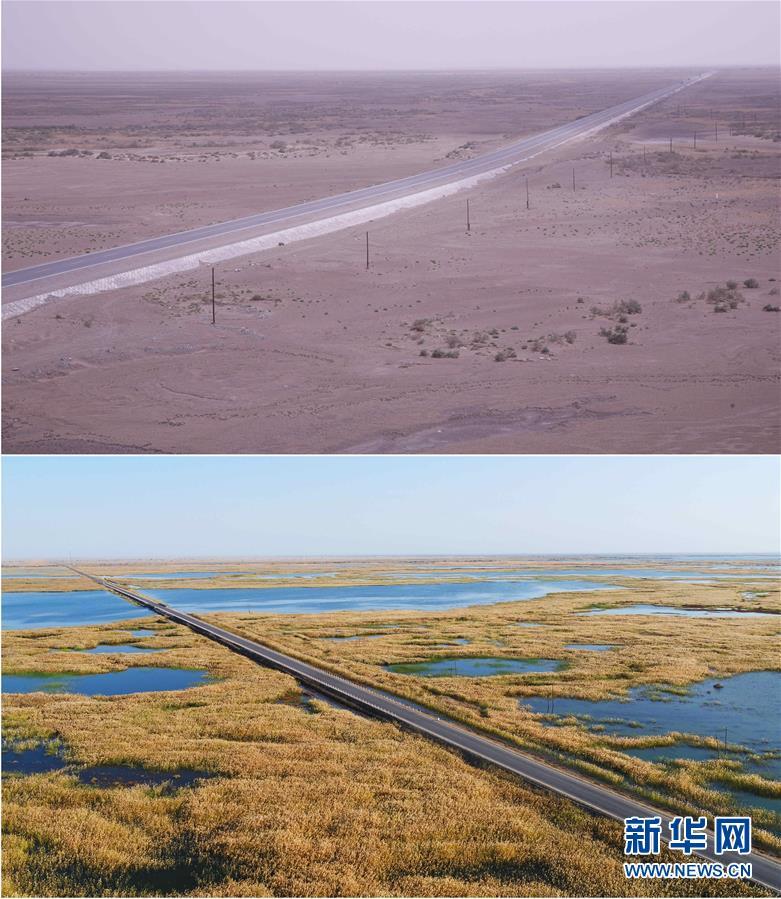 拼版照片:上图为塔里木河尾闾——几近干涸的台特玛湖(2008年7月24日摄);下图为从2000年起,随着向塔河下游生态输水的持续实施,台特玛湖重现生机(2017年10月10日无人机拍摄)。 新华社发(肖玉磊 摄)